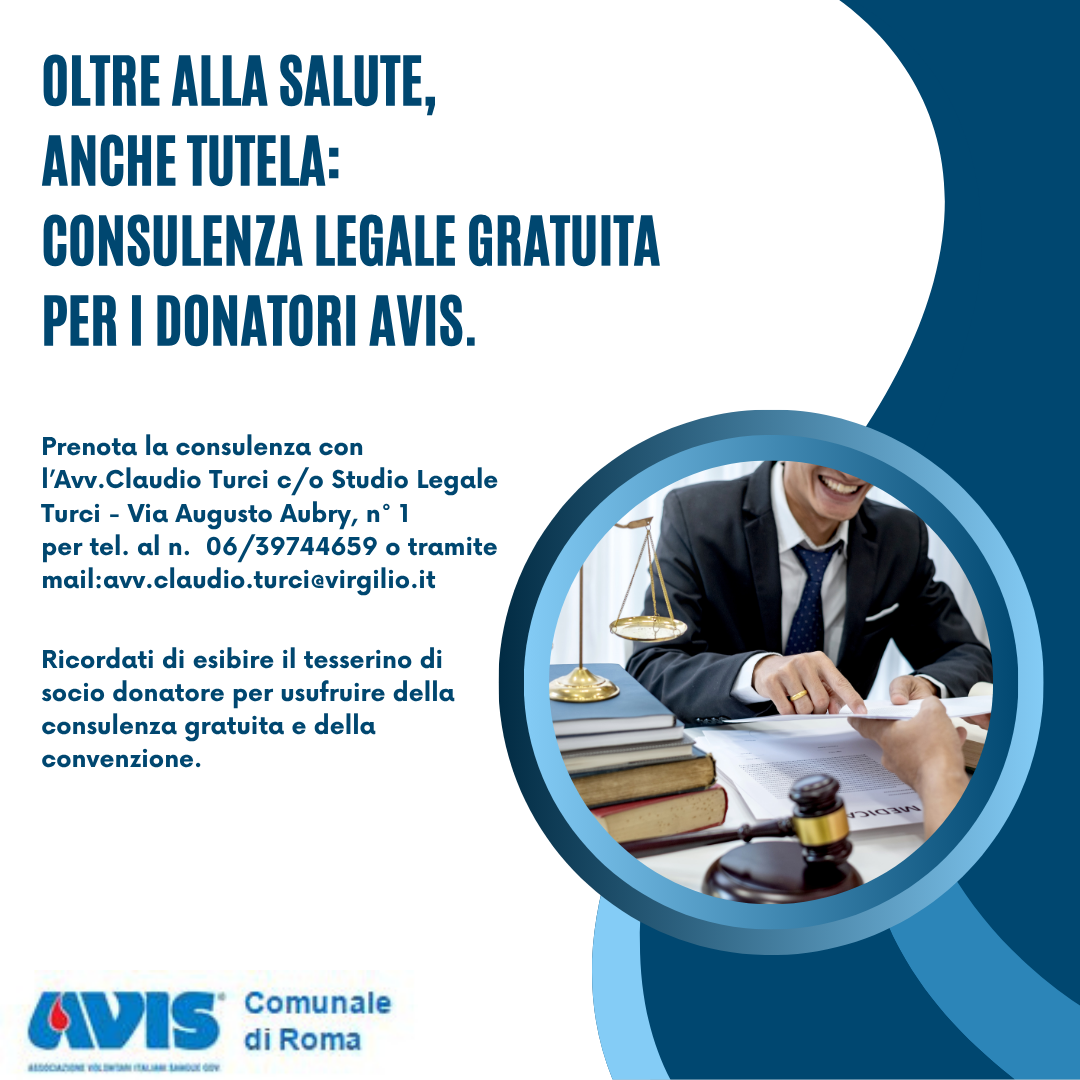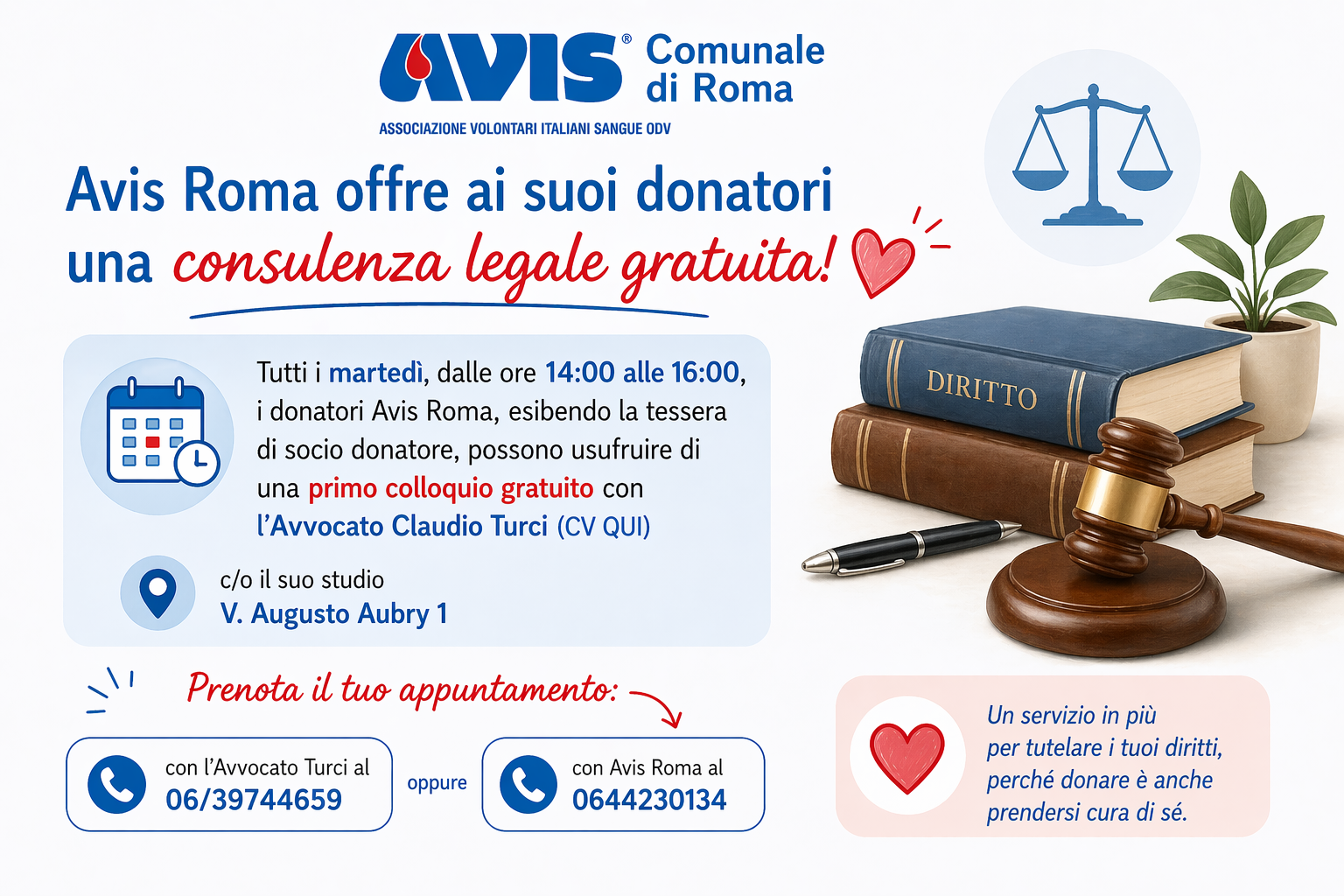 Tutti i martedì, dalle ore 14:00 alle 16:00, i donatori Avis Roma, esibendo la tessera di socio donatore, possono usufruire di una primo colloquio gratuito con l'Avvocato Claudio Turci (CV QUI) c/o il suo studio V. Augusto Aubry 1, prenotando con lui al n. 06/39744659 o con noi al n. 0644230134 .