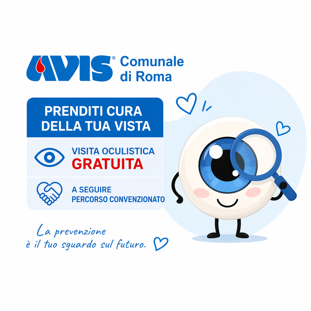 A partire da settembre 2026 esibendo il tesserino di socio donatore Avis Roma potrai partecipare a una visita oculistica gratuita (comprensiva di valutazione alla lampada a fessura, misurazione vista, esame del fondo oculare e tono) per prevenire e monitorare la salute dei tuoi occhi con la Dott.ssa Mariangela Gari c/o Via Dardanelli 46, ogni terzo lunedì del mese dalle ore 8:00 alle ore 9:30.